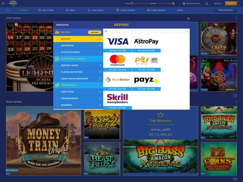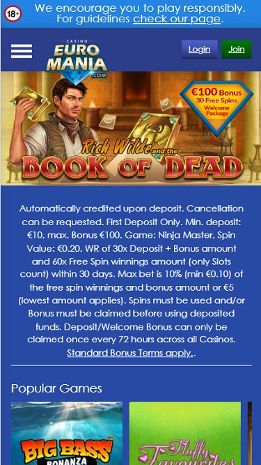 EuroMania 是一個線上博彩網站,成立於 2016 年,營運範圍不受庫拉索管轄。該網站似乎提供大量來自頂級開發商的遊戲,並且獎金條款也相當優厚,但提款需要 48 小時才能處理,到帳時間可能長達 7 個工作天。