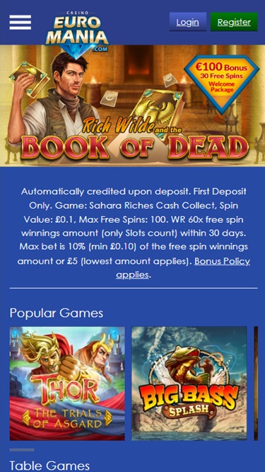 EuroMania 賭場由 Microgaming, Net Entertainment, Playtech, 1x2gaming, Barcrest, Big Time Gaming, ELK Studios, Evolution Gaming, EYECON, Ezugi, iSoftBet, lightningboxgames, Oryx, Play'n GO, playson, Quickspin, Rabcat, Relax Gaming, Thunderkick, Yggdrasil, Wazdan, Realistic Games, Booming Games, Stakelogic, Pragmatic Play, Nolimit City, Red Tiger Gaming, Fantasma Games, SYNOT Games, Kalamba, Spin Games, Triple Edge Studios, Northern Lights Gaming, Switch Studios, Electric Elephant Games, Bulletproof Games, All41 Studios, Gameburger Studios, Neon Valley Studios, Golden Rock Studios, Spearhead Studios, SpinPlay Games, GONG Gaming, Blue Guru Games, Lady Luck Games, Holle Games, Buck Stakes Entertainment, Games Global, Amusnet Interactive, 2by2 Gaming, Ash Gaming, Bally Technologies, bluberi, Blueprint Gaming, Merkur Gaming, NextGen, NYX Interactive, Push Gaming, Skill on Net, WMS, Inspired Gaming, Gaming Realms, Cayetano, SG Interactive, Gamomat, Red7Mobile, Scientific Games, Reel Time Gaming, Authentic Gaming, Bally Wulff, Iron Dog Studio, Old Skool Studios, Foxium, Just For The Win, Reflex Gaming, Storm Gaming Technology, Wild Streak Gaming, Slingshot Studios, Golden Hero, Fortune Factory Studios, STHLM Gaming, 4ThePlayer, AvatarUX, Gamevy, Crazy Tooth Studio, ReelPlay, Japan Technicals Games, Alchemy Gaming, Rarestone Gaming, BB Games, Black Pudding Games, Snowborn Games, Boomerang Studios, Hacksaw Gaming, Max Win Gaming, Gold Coin Studios, Bang Bang Games, Half Pixel Studios, SilverBack Gaming, Peter And Sons, Aurum Signature Studios, Armadillo Studios, Lucksome Gaming, Area Vegas, Funky Games, Print Studios, Gaming Corps, HammerTime Games, Four Leaf Gaming, INO Games, Nailed It! Games, Atomic Slot Lab, Neko Games, Reel Kingdom, Oros Gaming, JVL and Light & Wonder提供支持,網站的遊戲透過可下載的軟體以及即時遊戲平台提供,玩家可以透過電腦上的網路瀏覽器進行遊戲。該網站還支援行動端遊戲,玩家可以使用智慧型手機或平板電腦進行投注。Baccarat