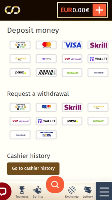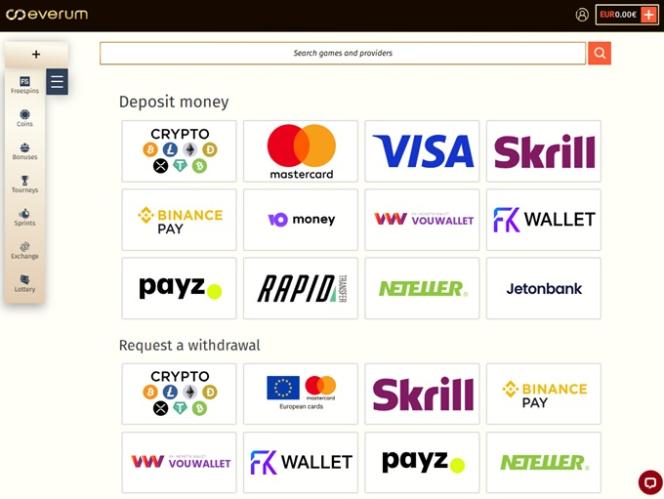 Everum Casino 的銀行系統非常完善,支付速度也非常快。賭場接受比特幣、Visa、萬事達卡和電子錢包的存款和付款。賭場的待處理時間為 4 小時,電子錢包付款時間為 4 小時,而其他方式可能需要更長。不過,速度還是很快的。每月獎金提現限額為 4 萬美元。