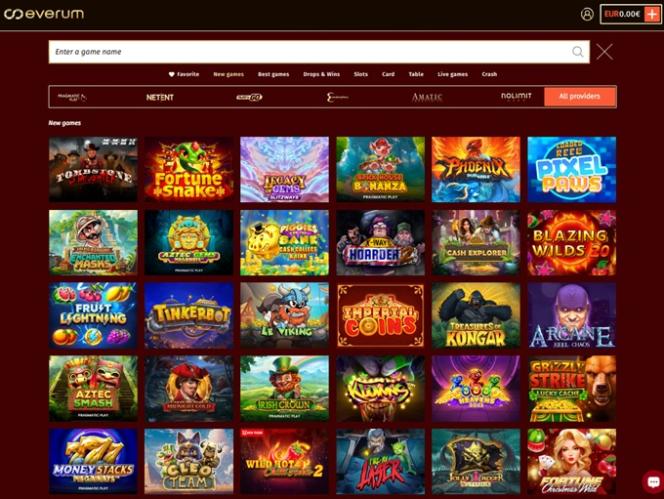 Everum Casino 由 Microgaming, Net Entertainment, Playtech, BetSoft, 1x2gaming, Amatic Industries, Big Time Gaming, ELK Studios, Evolution Gaming, Habanero Systems, Novomatic, Play'n GO, playson, Quickspin, Relax Gaming, Thunderkick, WM, Yggdrasil, Endorphina, Wazdan, GameArt, Booming Games, Pragmatic Play, Nolimit City, Red Tiger Gaming, Booongo, LuckyStreak, Spinomenal, Red Rake Gaming, Skillzzgaming, Fugaso, Fantasma Games, Revolver Gaming, Platipus Gaming, Spinmatic, Spadegaming, Triple Edge Studios, BGAMING, Northern Lights Gaming, Evoplay, Stormcraft Studios, Electric Elephant Games, Pocket Games Soft, Bulletproof Games, All41 Studios, Gluck Games, Mascot Gaming, NetGame Entertainment, Gameburger Studios, Pulse 8 Studios, Neon Valley Studios, Golden Rock Studios, Swintt, SpinPlay Games, Mancala Gaming, GONG Gaming, Blue Guru Games, Buck Stakes Entertainment, Games Global, Amusnet Interactive, Wizard Games, Ash Gaming, Blueprint Gaming, Greentube, NeoGames, Pariplay, Push Gaming, Tom Horn Gaming, Gamomat, Reel Time Gaming, BF Games, Ganapati, Iron Dog Studio, Old Skool Studios, Foxium, Just For The Win, We Are Casino, Reflex Gaming, Storm Gaming Technology, PearFiction Studios, Apollo Games, Wild Streak Gaming, Slingshot Studios, Fortune Factory Studios, Jade Rabbit Gaming, STHLM Gaming, 4ThePlayer, AvatarUX, Gamevy, Crazy Tooth Studio, High 5 Games, ReelPlay, Alchemy Gaming, Rarestone Gaming, Black Pudding Games, Snowborn Games, Boomerang Studios, Hacksaw Gaming, Max Win Gaming, Gold Coin Studios, Bang Bang Games, Half Pixel Studios, Slotmill, Peter And Sons, Eurostar Studios, Aurum Signature Studios, FastSpin, Gamebeat, Playgon, Aviatrix, 3 Oaks Gaming, Spribe, Circular Arrow, HammerTime Games, Markor Technology, Nailed It! Games, Neko Games and Reel Kingdom提供支持,其賭場遊戲可透過網頁即時遊戲平台暢玩,無需下載任何內容,直接透過網路瀏覽器即可暢玩。該網站還全面支援行動裝置遊戲,方便您在智慧型手機或平板電腦上暢玩。