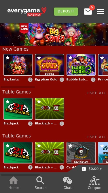 Everygame Casino 擁有井然有序的遊戲庫和易於使用且美觀的博彩平台,其構建符合當前線上博彩市場的技術標準。這家面向美國用戶的線上賭場接受加密貨幣,並提供全面優化的行動平台,完美適合所有可用裝置的螢幕。