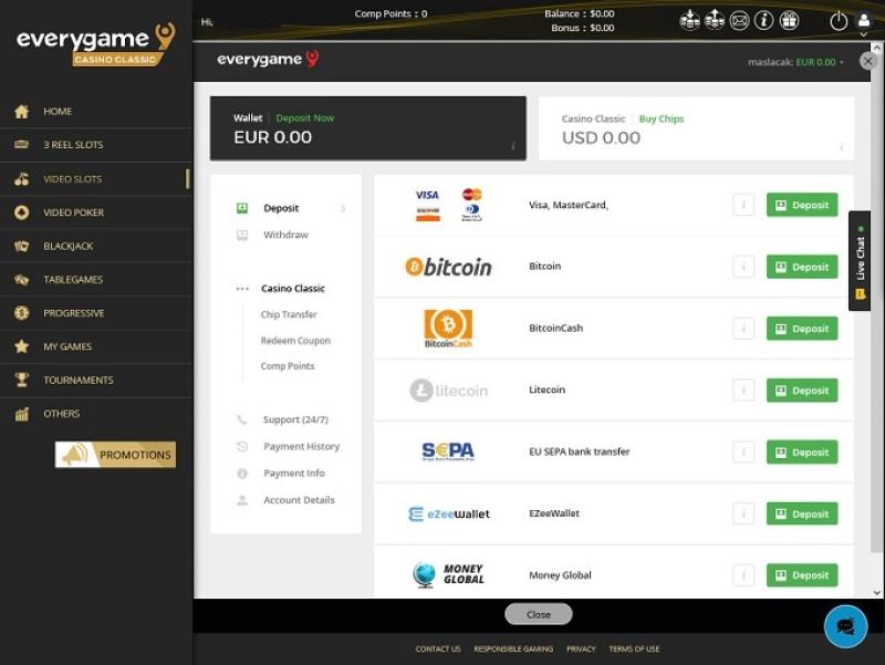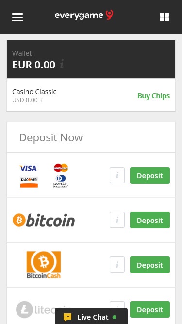 Everygame Classic Casino 提供多種支付方式,包括加密貨幣存款和提款、信用卡、金融卡和預付卡、電子錢包等。