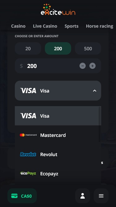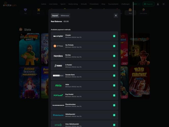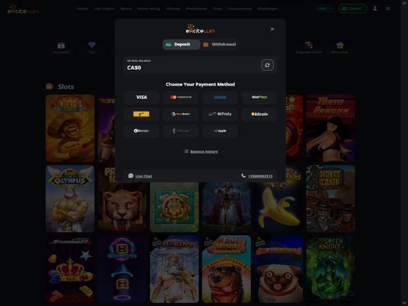 ExciteWin 為其賭場會員提供了多種銀行業務選項;在存款選項卡中,您可以找到幾乎所有流行的支付解決方案,從傳統的銀行業務方式到電子錢包和加密貨幣。