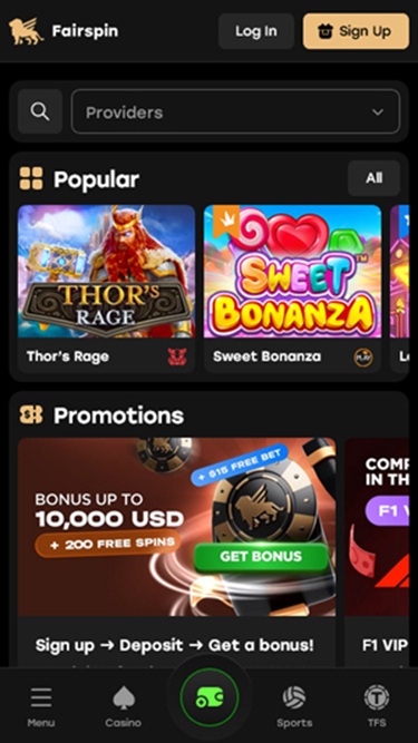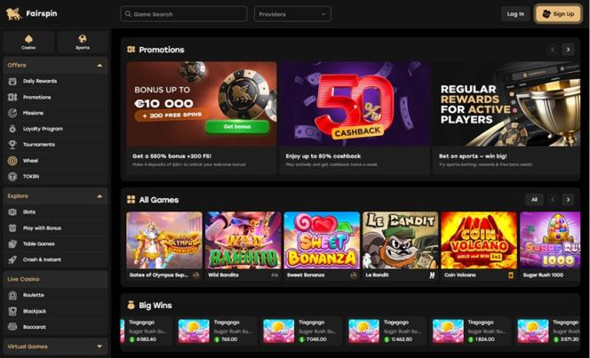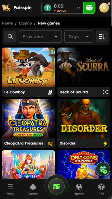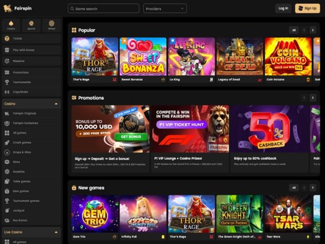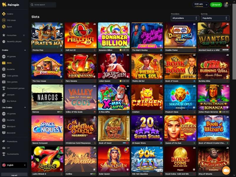 Fairspin 賭場設有老虎機專區,讓玩家樂此不疲。許多線上賭場玩家認為這類遊戲最具吸引力,原因在於——無需遵循過多的遊戲規則,即可享受如此多的樂趣和刺激。