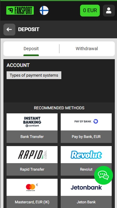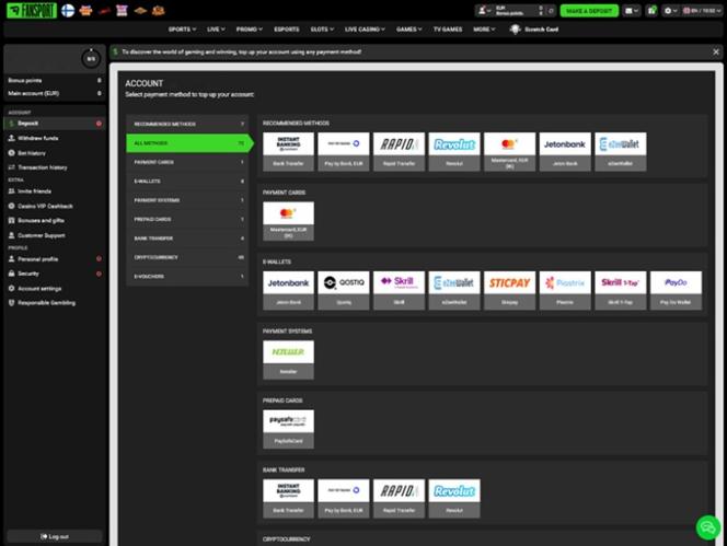 Fansport Casino 的一大優勢在於,營運商為玩家提供多種傳統和現代銀行服務,方便他們管理資金。傳統銀行服務包括Visa 、萬事達卡、銀行電匯、 Skrill 、 Neteller 、 Jeton 、 Neosurf等。而現代銀行服務則包括比特幣、比特幣現金、卡爾達諾、達世幣、狗狗幣、波卡、 EOS 、以太坊、萊特幣、 ZCash 、門羅幣和Toncoin等加密貨幣。
