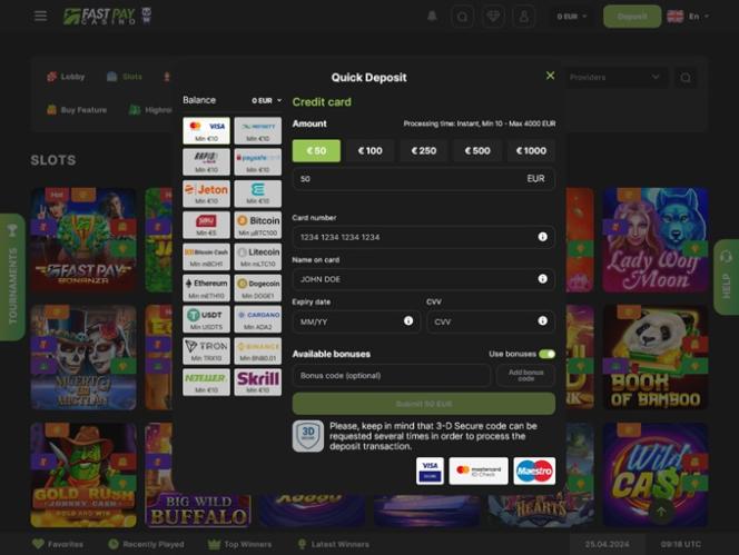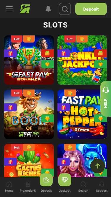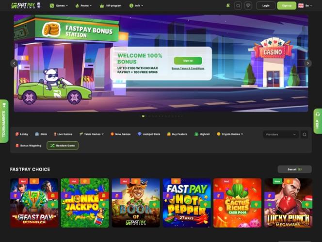 Fastpay Casino 由 Microgaming, Net Entertainment, Playtech, BetSoft, Amatic Industries, ELK Studios, Evolution Gaming, EYECON, Habanero Systems, lightningboxgames, Oryx, Play'n GO, playson, Quickspin, Thunderkick, Yggdrasil, Endorphina, Wazdan, Realistic Games, GameArt, Pragmatic Play, Nolimit City, Red Tiger Gaming, Booongo, Spinomenal, Red Rake Gaming, Belatra Games, Kalamba, Platipus Gaming, Nucleus Gaming, Triple Edge Studios, BGAMING, Northern Lights Gaming, Evoplay, Stormcraft Studios, Bulletproof Games, All41 Studios, Gluck Games, Mascot Gaming, NetGame Entertainment, Gameburger Studios, Pulse 8 Studios, Neon Valley Studios, Golden Rock Studios, Swintt, TrueLab Games, SpinPlay Games, Mancala Gaming, KA Gaming, GONG Gaming, Holle Games, Buck Stakes Entertainment, Games Global, Reevo, Amusnet Interactive, CT Interactive, Tom Horn Gaming, Mr Slotty, Old Skool Studios, Foxium, Just For The Win, Reflex Gaming, PearFiction Studios, Wild Streak Gaming, Slingshot Studios, Fortune Factory Studios, Gamevy, Crazy Tooth Studio, ReelPlay, Alchemy Gaming, Snowborn Games, Hacksaw Gaming, Max Win Gaming, Gold Coin Studios, Bang Bang Games, Half Pixel Studios, Arcadem, Peter And Sons, Eurostar Studios, Aurum Signature Studios, Onlyplay, Gamebeat, Area Vegas, 3 Oaks Gaming, Wishbone Games, Apparat Gaming, Circular Arrow, 1spin4win, Bet2Tech, HammerTime Games, INO Games, Nailed It! Games, Atomic Slot Lab, Reel Kingdom, Oros Gaming, Indigo Magic, Spinza, Popiplay and VoltEnt提供支持,玩家可以使用網路瀏覽器存取網站。該賭場擁有引人入勝的外觀和體驗,並且還兼容行動裝置。