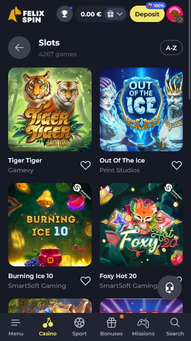 整個遊戲集合被很好地劃分為主要類別:賭場、真人娛樂場、體育和電子競技,並進一步劃分為子類別,例如老虎機、即時贏、原創、購買獎金、累積獎金、刮刮樂、輪盤賭、二十一點等。