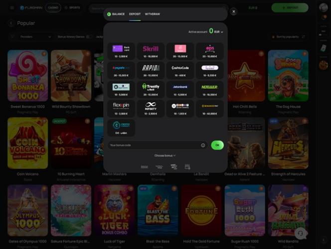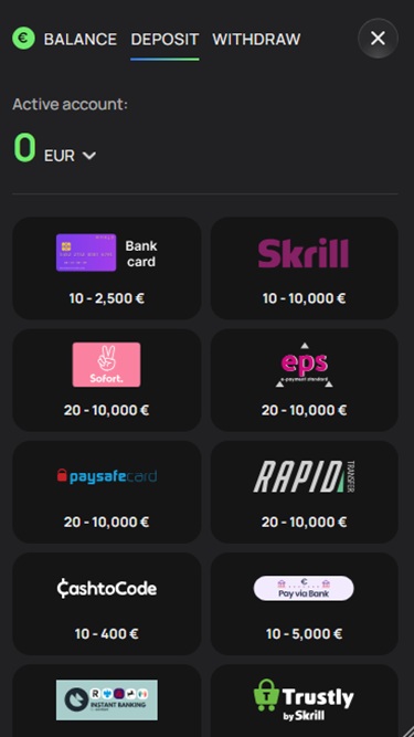 如果您想在 Flagman Casino 存款和提款,您可以使用各種支付方式,例如Visa 、 Mastercard 、 Apple Pay 、 Skrill 、 Neteller 、 Paysafecard 、 Mifinity等。玩家還可以使用比特幣、比特幣現金、狗狗幣、以太坊、萊特幣、 Toncoin 、 Tron 、 USD Coin 、 Tether和瑞波幣等加密貨幣管理資金。