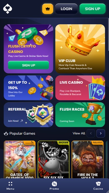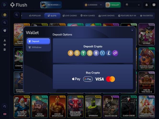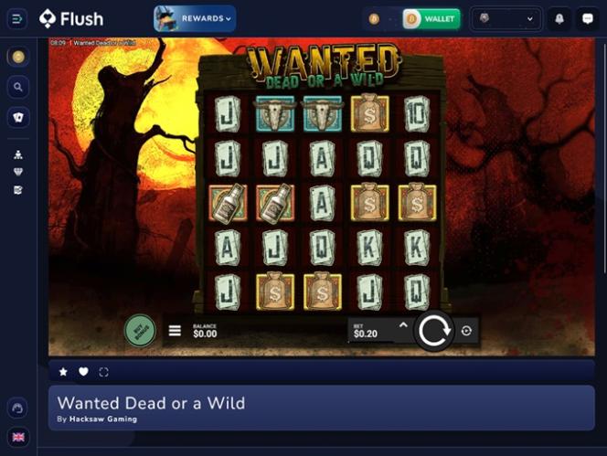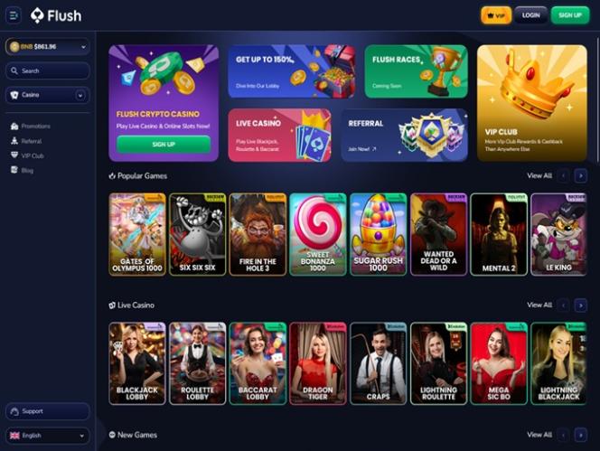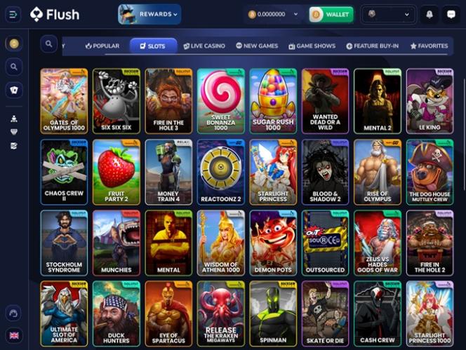 網站結構良好,一些可用的類別包括:熱門遊戲、新遊戲、Flush Originals、真人娛樂場、特色買入、遊戲節目、老虎機、提供者、促銷和 Flush 比賽。