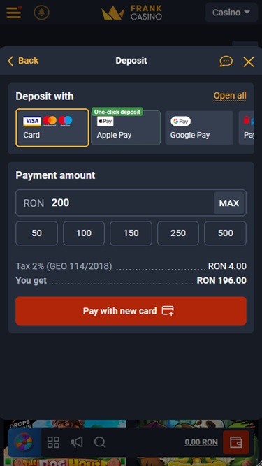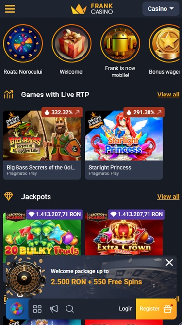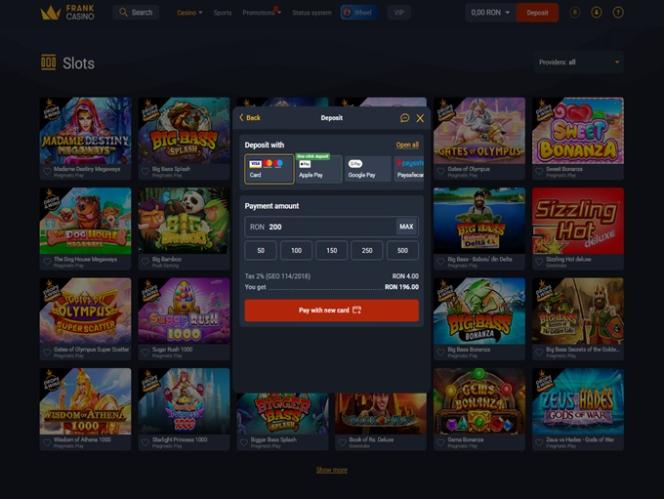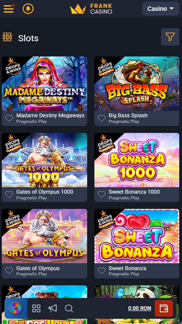 Frank Casino 由 Microgaming, Net Entertainment, Playtech, BetSoft, 1x2gaming, Amatic Industries, Big Time Gaming, ELK Studios, Evolution Gaming, EYECON, Ezugi, Genesis Gaming, Habanero Systems, iSoftBet, lightningboxgames, Novomatic, Oryx, Play'n GO, playson, Quickspin, Rabcat, Relax Gaming, Rival, Thunderkick, Yggdrasil, Endorphina, Wazdan, Realistic Games, GameArt, Betgames, Booming Games, Stakelogic, Pragmatic Play, Nolimit City, Felt Gaming, Red Tiger Gaming, Booongo, Spinomenal, Red Rake Gaming, Skillzzgaming, Fugaso, Belatra Games, Fantasma Games, SYNOT Games, Kalamba, Revolver Gaming, Spin Games, Skywind, Triple Edge Studios, Northern Lights Gaming, Fazi, Evoplay, Stormcraft Studios, Switch Studios, SA Gaming, Electric Elephant Games, Pocket Games Soft, Bulletproof Games, All41 Studios, Gluck Games, Mascot Gaming, Gameburger Studios, Pulse 8 Studios, Neon Valley Studios, Golden Rock Studios, Swintt, TrueLab Games, SpinPlay Games, SmartSoft Gaming, Real Dealer Studios, Blue Guru Games, On Air Entertainment, Buck Stakes Entertainment, Games Global, Amusnet Interactive, 2by2 Gaming, Ainsworth, Ash Gaming, bluberi, Blueprint Gaming, CT Interactive, Greentube, Push Gaming, Tom Horn Gaming, Inspired Gaming, Gamomat, Reel Time Gaming, Authentic Gaming, BF Games, betiXon, Iron Dog Studio, Old Skool Studios, Foxium, Just For The Win, Reflex Gaming, Storm Gaming Technology, Bla Bla Bla Studios, PearFiction Studios, Apollo Games, Wild Streak Gaming, Slingshot Studios, Golden Hero, Fortune Factory Studios, STHLM Gaming, RubyPlay, 4ThePlayer, AvatarUX, Gamevy, Crazy Tooth Studio, NetGaming, ReelPlay, Japan Technicals Games, Zonelock, Alchemy Gaming, Rarestone Gaming, Black Pudding Games, Snowborn Games, Boomerang Studios, Hacksaw Gaming, Max Win Gaming, Gold Coin Studios, Bang Bang Games, Gamzix, Half Pixel Studios, Arcadem, Slotmill, SilverBack Gaming, Peter And Sons, Aurum Signature Studios, Lucksome Gaming, Area Vegas, ELA Games, Leap Gaming, 3 Oaks Gaming, Wishbone Games, Spribe, Circular Arrow, Print Studios, Gaming Corps, HammerTime Games, Four Leaf Gaming, INO Games, Nailed It! Games, Atomic Slot Lab, Neko Games, Reel Kingdom, Oros Gaming, Givme Games, Indigo Magic, VoltEnt and Boldplay提供支持,其遊戲透過即時遊戲的網頁平台提供,可直接透過您的網頁瀏覽器載入。賭場還全面支援行動裝置遊戲,這意味著您可以透過智慧型手機或平板電腦暢玩 Frank Casino 的遊戲。