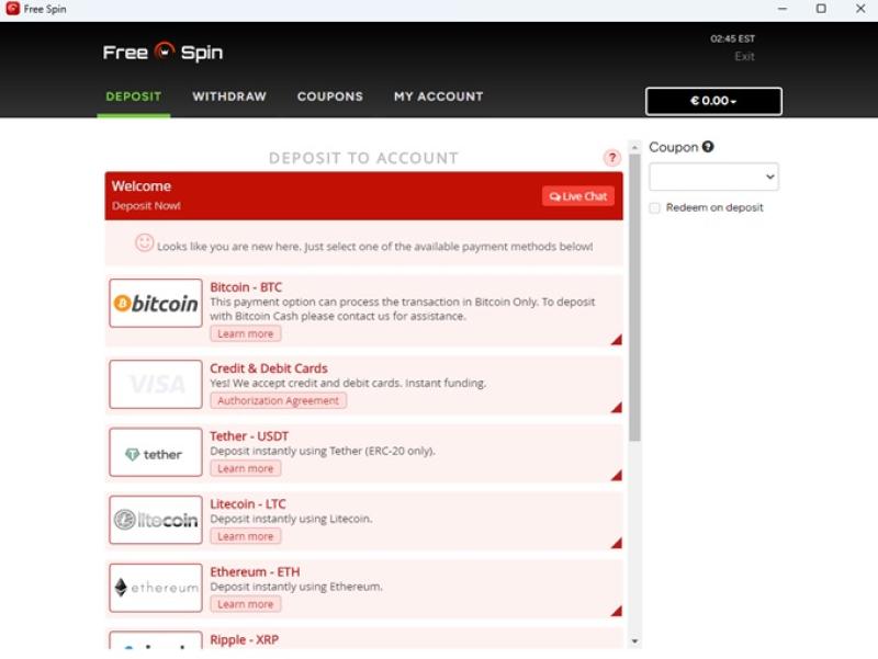 Banking銀⾏業務選項 的 Free Spin Casino