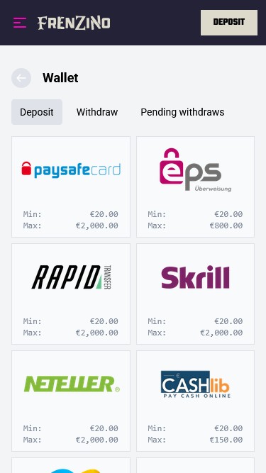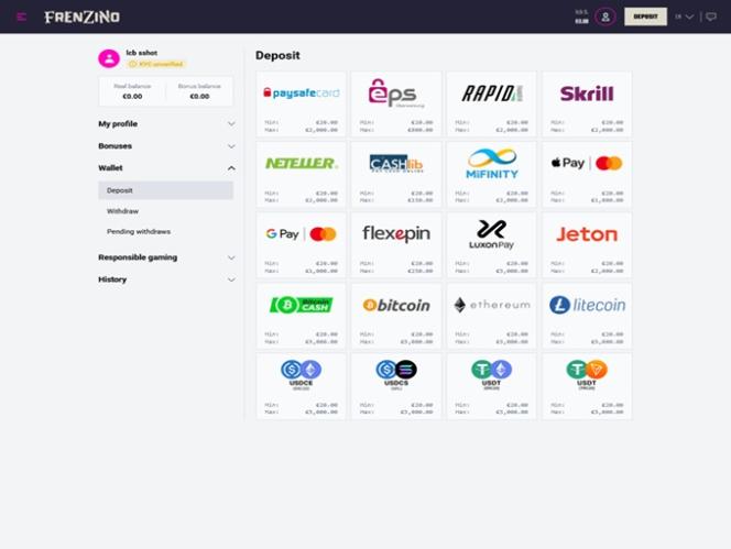 如果您喜歡使用加密貨幣進行存款和提款,您會很高興地聽到 Frenzino 接受多種加密貨幣,例如比特幣、以太幣和 USDT。