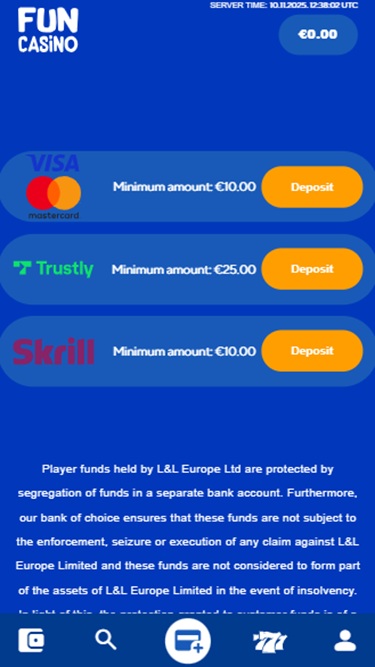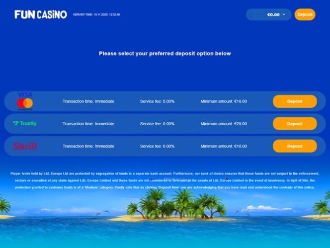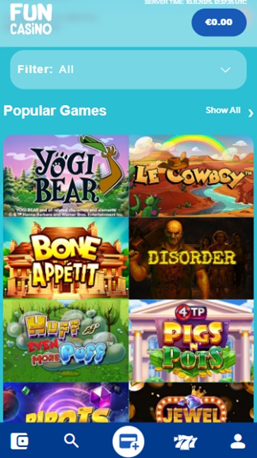 Fun Casino 由 Microgaming, Net Entertainment, 1x2gaming, Amatic Industries, Barcrest, Big Time Gaming, ELK Studios, Evolution Gaming, EYECON, lightningboxgames, Novomatic, Play'n GO, Relax Gaming, Thunderkick, Pragmatic Play, Nolimit City, Red Tiger Gaming, IGT, Spinomenal, Triple Edge Studios, Northern Lights Gaming, Stormcraft Studios, All41 Studios, Gameburger Studios, Neon Valley Studios, Shuffle Master, SpinPlay Games, GONG Gaming, Buck Stakes Entertainment, Games Global, Bally Technologies, Blueprint Gaming, Greentube, Merkur Gaming, NextGen, NYX Interactive, WMS, Inspired Gaming, SG Interactive, Red7Mobile, Reel Time Gaming, Iron Dog Studio, Foxium, Just For The Win, Wild Streak Gaming, Slingshot Studios, Fortune Factory Studios, 4ThePlayer, Crazy Tooth Studio, High 5 Games, Alchemy Gaming, Black Pudding Games, Hacksaw Gaming, Half Pixel Studios, Eurostar Studios, Aurum Signature Studios and Lucksome Gaming提供支持,其賭場遊戲透過基於網頁的即時遊戲平台提供,可直接透過您電腦上的網路瀏覽器載入。無需下載任何繁瑣的軟體,如果您願意,也可以在智慧型手機或平板電腦上暢玩。