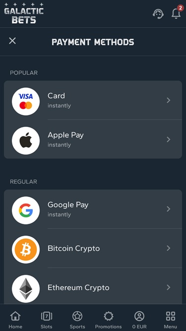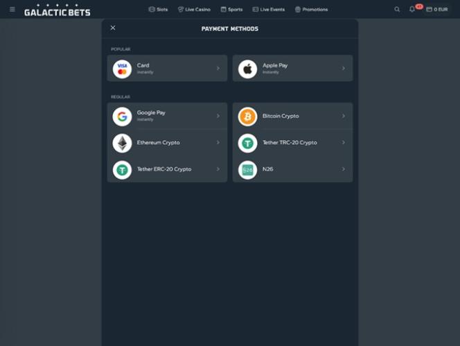 為了將您的遊戲體驗提升到全新高度,GalacticBets 還精心策劃了一系列完善的促銷活動,其中包含大量獎金、促銷活動和精彩賽事,供您參與。玩家可以領取歡迎獎金、賺取每週回饋、獲得忠誠度獎勵,或在整個遊戲過程中領取儲值獎金。