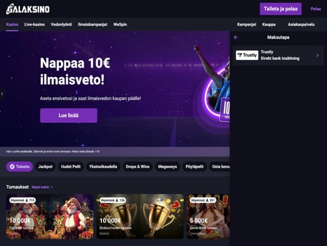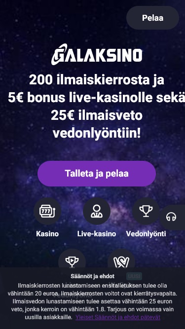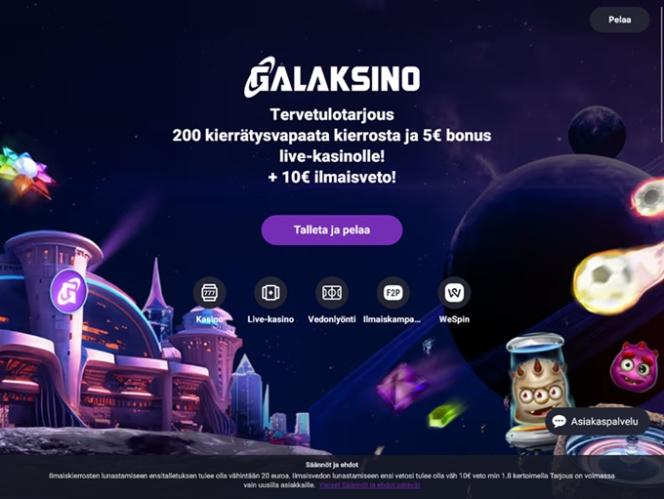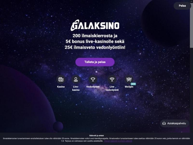 Galaksino Casino 是一家專門針對芬蘭玩家的線上賭場。該賭場由 Aqua Vitae Limited 擁有和經營,該公司由馬耳他博彩管理局 (MGA) 授權和監管。