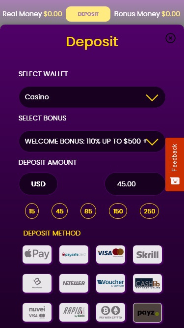 該賭場支援許多流行的支付方式,包括加密銀行和各種加密貨幣、借記卡和信用卡、即時銀行轉帳和全球流行的電子錢包,因此存款和提款既簡單又快速。