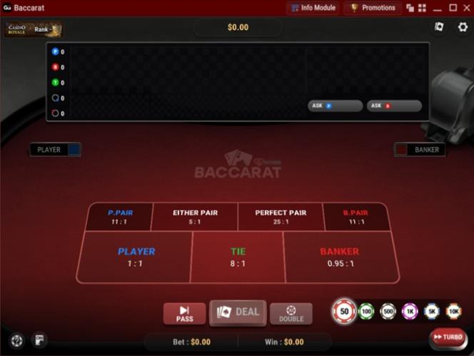 Baccarat使⽤六副與⼋副牌組在概率上會有些微的不同。以下列表顯⽰在兩種遊戲 中、針對所有三種押注的賭場優勢。