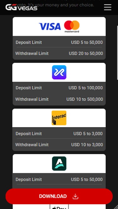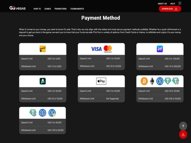 GGVegas 賭場可用的貨幣是比特幣和美元,除了加密貨幣方式之外的付款選項還包括銀行電匯、流行的支付卡、Apple Pay 和其他銀行服務。