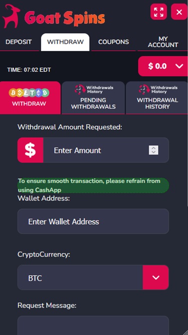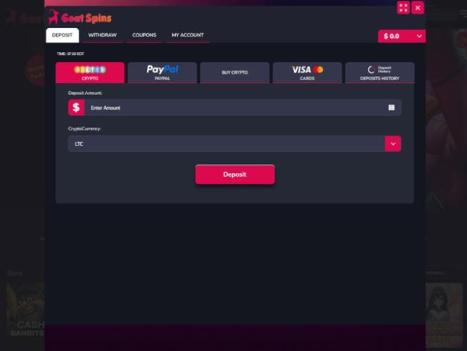 在這個線上博彩平台,您可以使用借記卡和信用卡,但 Goat Spins 僅接受主流加密貨幣存款。玩家可以從多種可用貨幣中進行選擇,包括比特幣、萊特幣、以太坊、幣安幣、泰達幣、比特幣現金、Solana、狗狗幣、波場幣…