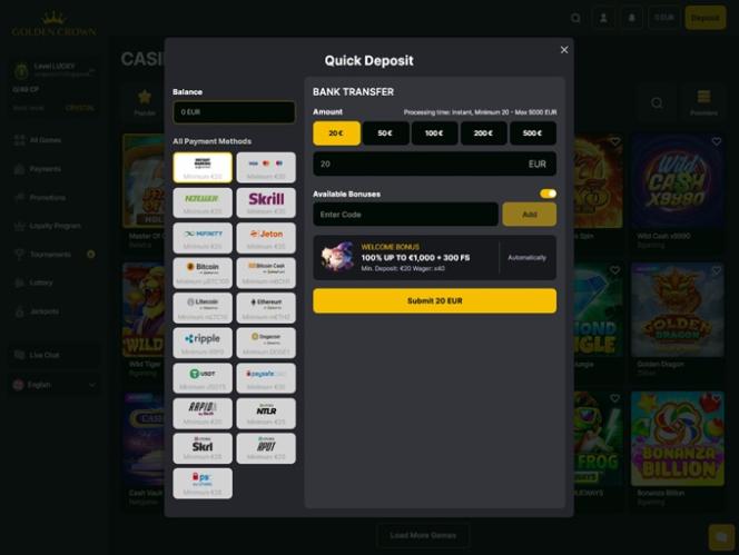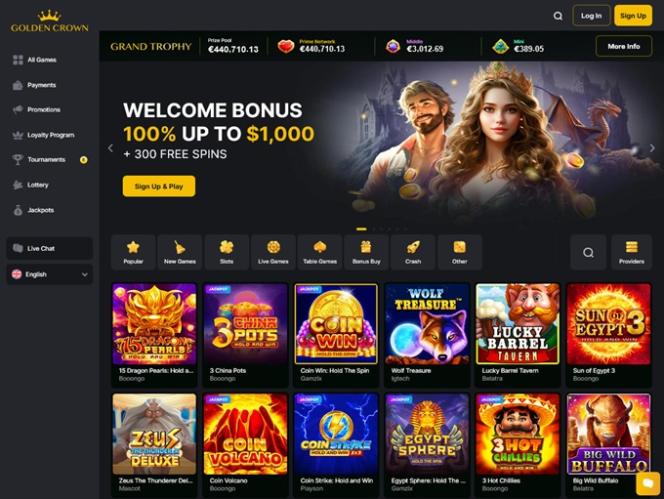 Golden Crown 由 Microgaming, Net Entertainment, Playtech, BetSoft, Amatic Industries, Big Time Gaming, ELK Studios, Evolution Gaming, EYECON, Ezugi, Genesis Gaming, Habanero Systems, iSoftBet, lightningboxgames, Novomatic, Oryx, Play'n GO, playson, Quickspin, Relax Gaming, SOFTSWISS, Thunderkick, Vivo Gaming, Yggdrasil, Endorphina, Wazdan, GameArt, Booming Games, Pragmatic Play, Nolimit City, Red Tiger Gaming, Booongo, Spinomenal, Felix Gaming, Red Rake Gaming, Skillzzgaming, Fugaso, Belatra Games, Fantasma Games, Kalamba, Revolver Gaming, Spin Games, Platipus Gaming, Nucleus Gaming, Triple Edge Studios, BGAMING, Northern Lights Gaming, Fazi, Evoplay, Stormcraft Studios, IGTech, Switch Studios, Electric Elephant Games, Pocket Games Soft, Bulletproof Games, Gluck Games, Mascot Gaming, TVBet, NetGame Entertainment, Gameburger Studios, Pulse 8 Studios, Neon Valley Studios, Golden Rock Studios, Spearhead Studios, Swintt, TrueLab Games, SpinPlay Games, Mancala Gaming, 7Mojos, SmartSoft Gaming, KA Gaming, Atmosfera, Real Dealer Studios, Blue Guru Games, On Air Entertainment, Buck Stakes Entertainment, Eurasian Gaming, Games Global, Reevo, Amusnet Interactive, Ash Gaming, Blueprint Gaming, CT Interactive, Greentube, Merkur Gaming, Push Gaming, Tom Horn Gaming, Gamomat, Reel Time Gaming, Authentic Gaming, Bally Wulff, Old Skool Studios, Foxium, Just For The Win, Reflex Gaming, PearFiction Studios, Wild Streak Gaming, Slingshot Studios, Golden Hero, Fortune Factory Studios, 4ThePlayer, AvatarUX, Gamevy, Crazy Tooth Studio, High 5 Games, Groove Gaming, ReelPlay, Japan Technicals Games, Alchemy Gaming, Rarestone Gaming, Snowborn Games, Boomerang Studios, Hacksaw Gaming, Max Win Gaming, Gold Coin Studios, Bang Bang Games, Gamzix, Half Pixel Studios, Arcadem, SilverBack Gaming, Peter And Sons, Absolute Live Gaming, Aurum Signature Studios, Onlyplay, Lucksome Gaming, Gamebeat, Playgon, Area Vegas, Bombay Live, 3 Oaks Gaming, Wishbone Games, Apparat Gaming, Spribe, Circular Arrow, Print Studios, 1spin4win, 5Men Gaming, HammerTime Games, Four Leaf Gaming, INO Games, Nailed It! Games, Atomic Slot Lab, Neko Games, Reel Kingdom, Oros Gaming, Givme Games, JVL, Indigo Magic, Live88 and Zillion Games提供支持,遊戲透過網頁平台提供,這意味著您無需下載任何內容到電腦上。網站略顯平淡,但功能齊全。遊戲支援行動端,玩家可以透過智慧型手機和平板電腦暢玩。
