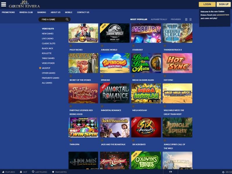 Golden Riviera 賭場由 Microgaming, Net Entertainment, Evolution Gaming, Play'n GO, Quickspin, Yggdrasil, Games Global, NYX Interactive, Genii, SG Interactive and Scientific Games提供支持,提供數百款精選遊戲。該賭場提供網頁平台和可下載的客戶端軟體。此外,也提供行動博弈網站,方便隨時隨地暢玩。