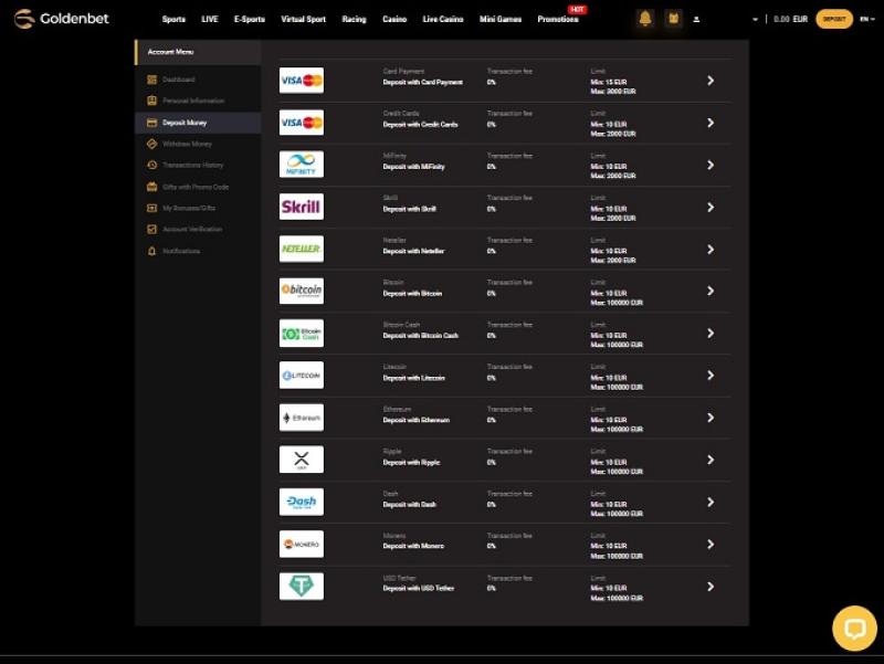 加密貨幣具有高度的隱私性,越來越多的賭徒發現加密貨幣支付方式非常適合線上賭場,因為這類交易速度非常快,而且通常手續費較低。除了加密貨幣,Goldenbet Casino 還提供其他熱門支付方式。