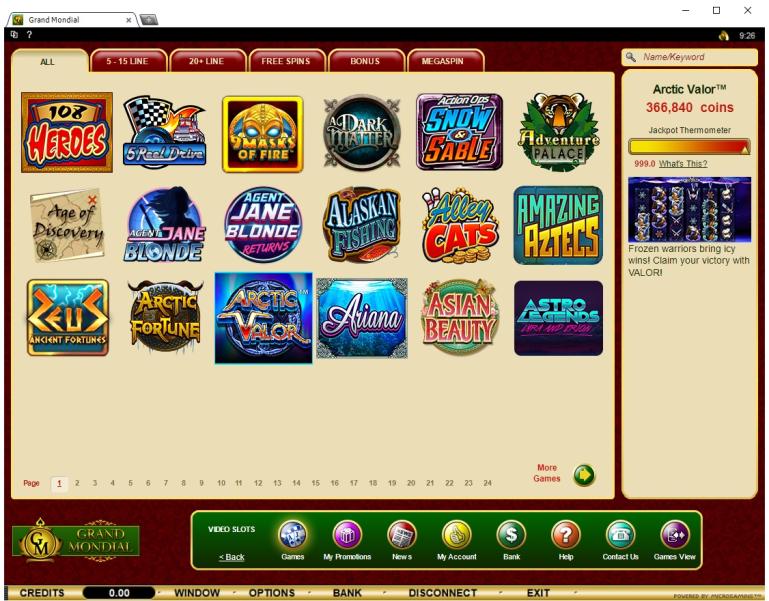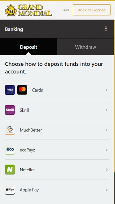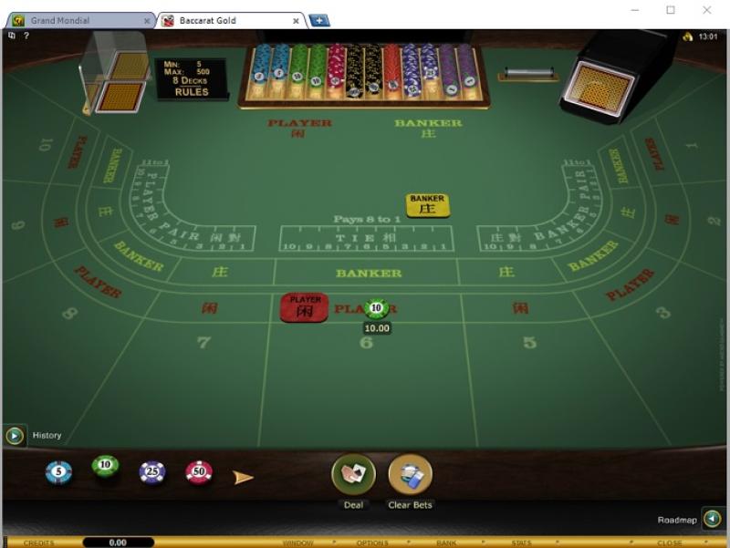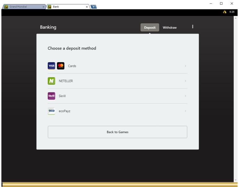 Grand Mondial Casino 由 Microgaming, Rabcat, Triple Edge Studios, Northern Lights Gaming, Stormcraft Studios, Switch Studios, Electric Elephant Games, All41 Studios, Gameburger Studios, Pulse 8 Studios, Neon Valley Studios, SpinPlay Games, Real Dealer Studios, GONG Gaming, On Air Entertainment, Buck Stakes Entertainment, Games Global, Old Skool Studios, Foxium, Just For The Win, PearFiction Studios, Slingshot Studios, Fortune Factory Studios, Crazy Tooth Studio, Alchemy Gaming, Snowborn Games, Gold Coin Studios, Half Pixel Studios, Eurostar Studios and Aurum Signature Studios提供支持,透過網頁端和可下載的用戶端軟體提供數百款遊戲。玩家還可以選擇行動投注,可在智慧型手機和平板電腦上使用。Baccarat