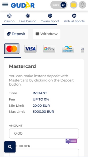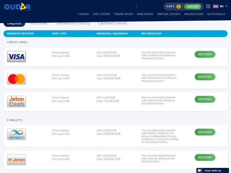 下面您可以找到 Gudar Casino 的不同銀行選項,包括存款和提款選項。
