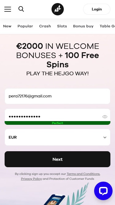 註冊過程快速方便。彈出視窗會引導新使用者完成註冊流程。我們似乎很快就在 Hejgo 完成了註冊,並在這個簡單的流程結束後獲得了兌換獎勵代碼和存款的選項。對於我們這些迫不及待想要體驗遊戲的人來說,這個選項非常方便。