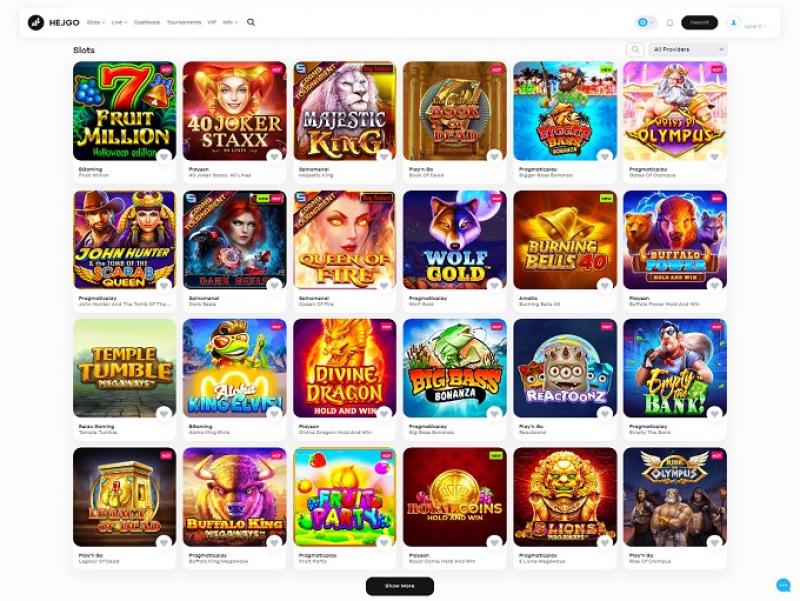 Hejgo 提供一系列組織的遊戲,例如:獎勵購買、書籍系列、神與神話、傳奇埃及、Megaways、經典機器、亞洲系列、珍貴寶石…