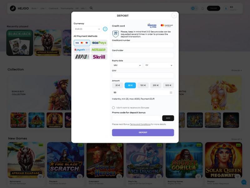 在 Hejgo Casino,玩家可以透過安全且受歡迎的支付方式(例如支付卡、電子錢包和銀行轉帳)進行存款和提款。