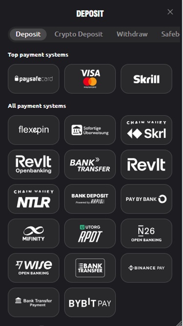這家賭場為用戶提供多種銀行提款和存款選項。使用標準支付方式的用戶可以選擇Visa 、 Mastercard 、 Neteller 、 Paysafecard 、 Skrill 、 Neosurf 、 MiFinity 、 Google Pay和Apple Pay 。比特幣、卡爾達諾、狗狗幣、波卡、以太坊、萊特幣、 Solana 、 Tether和瑞波幣等加密貨幣也是可行的選擇,它們提供更快、更匿名的提現,且手續費極低甚至為零。
