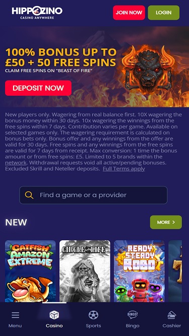 HippoZino Casino 是一個線上博弈網站,由 ProgressPlay Ltd. 於 2013 年創立。該賭場擁有龐大的遊戲庫,並以其快速支付獎金而聞名,儘管促銷活動的高額投注要求可能會讓一些人望而卻步。