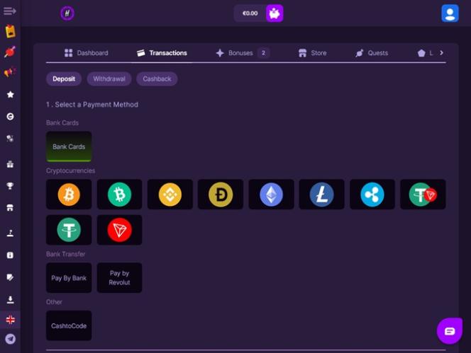 Hit Me Bet Casino 主要以加密貨幣為主,這意味著玩家可以使用多種加密貨幣進行存款和提款。支援的貨幣包括比特幣、比特幣現金、狗狗幣、以太幣、波場幣、泰達幣和瑞波幣。此外,網站也接受傳統的銀行轉帳方式,例如銀行電匯、 Revolut和Interac 。