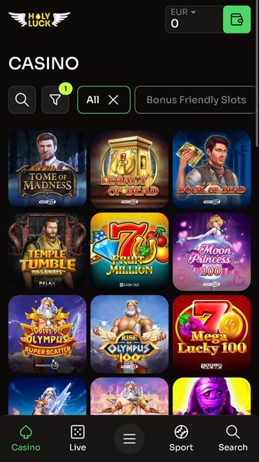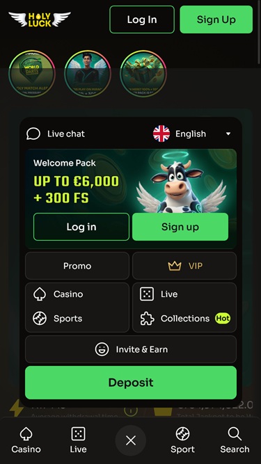 除了賭場遊戲,Holyluck 還設有一個獨立的體育博彩頁面,您每天都可以在這裡投注數百場體育賽事和電競比賽。這個體育博彩平台配備了所有必要的功能,包括即時投注,方便您隨時參與投注。