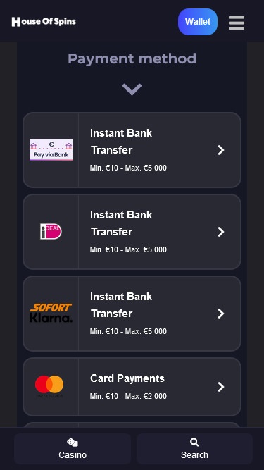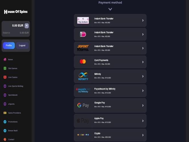 如果您已經切換到加密貨幣支付,House of Spins 賭場支援多種主流加密貨幣和錢包,讓您輕鬆快速地進行現場交易。請注意,提現速度令人滿意。