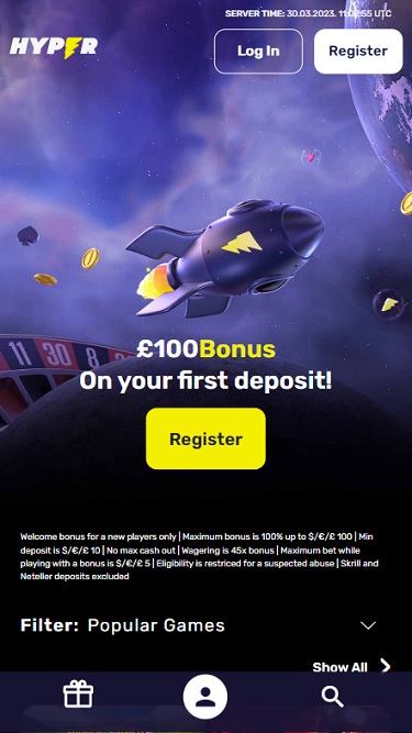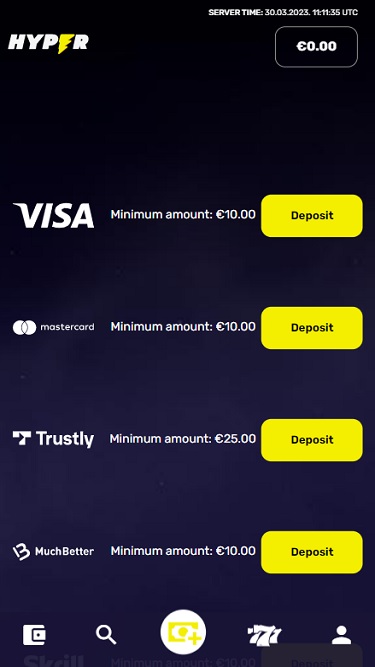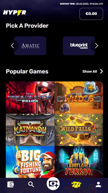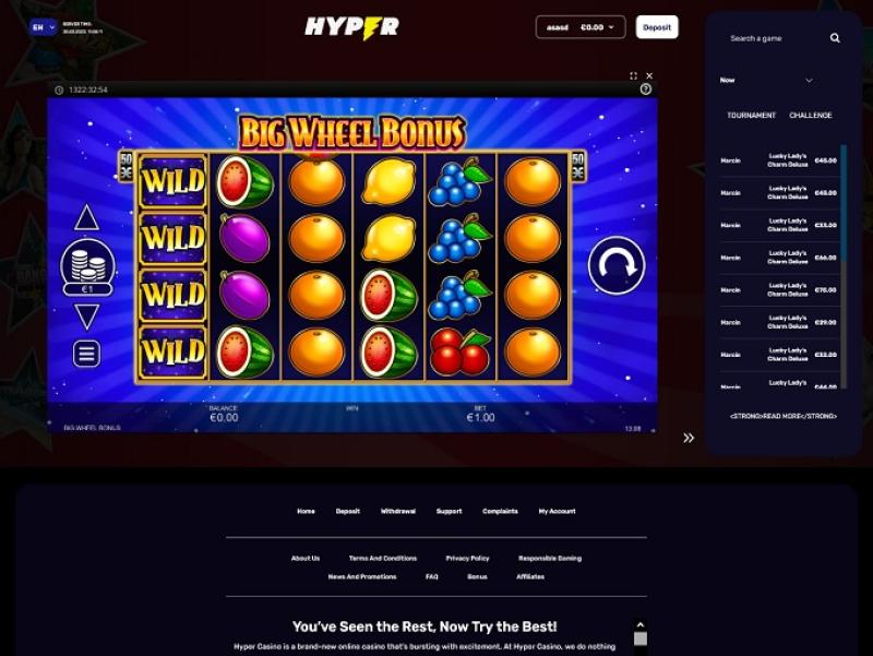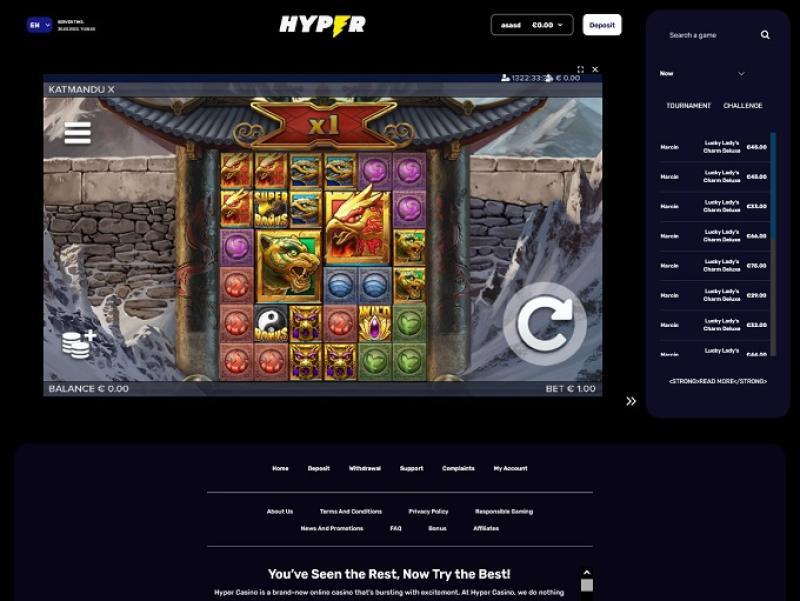 Hyper Casino 由 Microgaming, Net Entertainment, 1x2gaming, Amatic Industries, Barcrest, Big Time Gaming, ELK Studios, Evolution Gaming, lightningboxgames, Novomatic, Play'n GO, Relax Gaming, Thunderkick, Stakelogic, Pragmatic Play, Nolimit City, Red Tiger Gaming, IGT, Spinomenal, Triple Edge Studios, Northern Lights Gaming, All41 Studios, Gameburger Studios, Pulse 8 Studios, Neon Valley Studios, Shuffle Master, SpinPlay Games, GONG Gaming, Buck Stakes Entertainment, Games Global, Blueprint Gaming, Greentube, Merkur Gaming, NextGen, NYX Interactive, WMS, Inspired Gaming, SG Interactive, Red7Mobile, Scientific Games, Reel Time Gaming, Iron Dog Studio, Foxium, Just For The Win, Wild Streak Gaming, Fortune Factory Studios, Crazy Tooth Studio, High 5 Games, Alchemy Gaming, Black Pudding Games, Snowborn Games, Hacksaw Gaming, Half Pixel Studios, Eurostar Studios, Aurum Signature Studios and Lucksome Gaming提供支持,平台可透過您的網頁瀏覽器訪問,無需下載繁瑣的軟體。網站功能完善,您可以輕鬆瀏覽,找到想玩的遊戲。此外,它還提供行動端支持,方便您在智慧型手機或平板電腦上進行博彩。