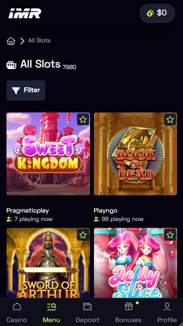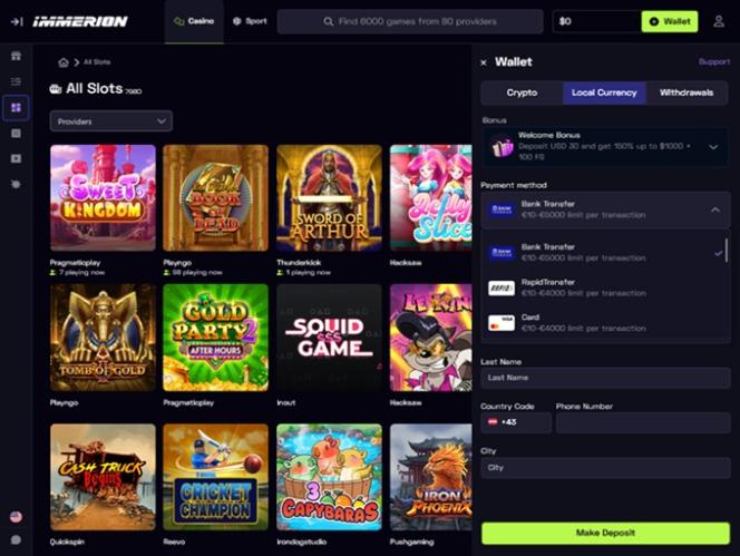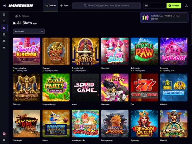 Immerion 賭場根據現代賭徒的期望精心挑選遊戲庫。在這裡,玩家可以體驗由領先軟體工作室和知名 iGaming 公司(例如BetSoft、NetEnt、Quickspin以及眾多其他知名線上博弈品牌)設計的遊戲。此外,其合作公司名單中還包括一些新興的創新開發商,這確保了遊戲的多樣性。
