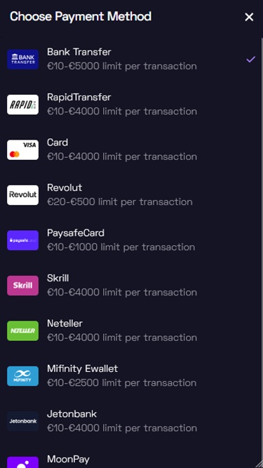 賭場收銀員支援傳統支付和加密貨幣支付。豐富的銀行支付方式包括電子錢包、金融卡、信用卡等。存款和提款支援多種法定貨幣和加密貨幣,例如比特幣、比特幣現金、狗狗幣、以太幣、泰達幣、萊特幣以及其他熱門貨幣。