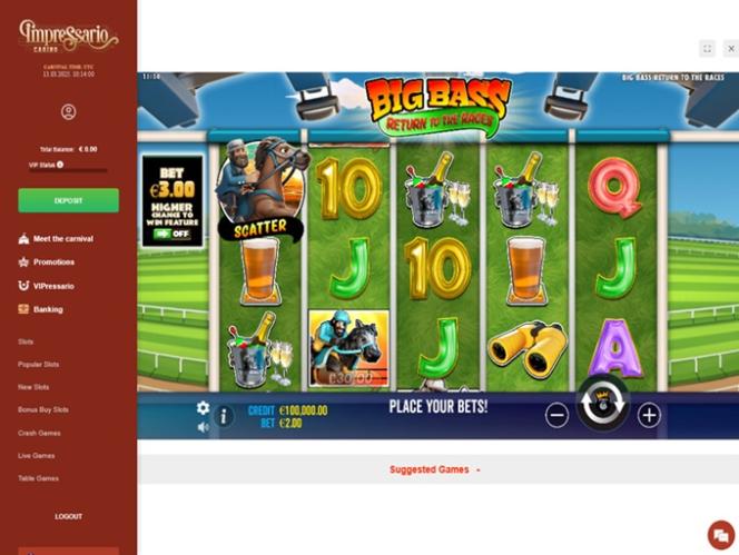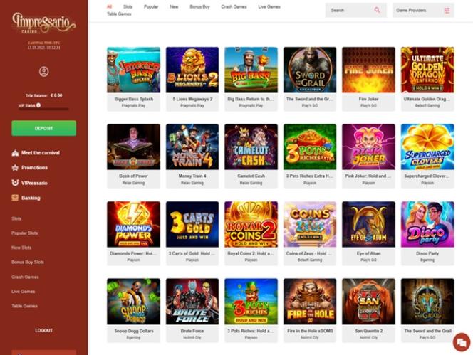 例如, Impressario Casino 擁有超過 120 家軟體開發商組成的龐大陣容,從而形成了一個龐大的遊戲庫,其中包含數千款獨特的遊戲供您暢玩。這裡總有一款適合您;即使是最資深的玩家也能輕鬆找到他們想要的遊戲。