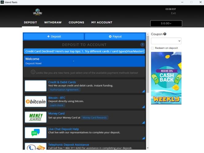 比特幣銀行選項、支付卡和電匯是 Island Reels Casino 提供的帳戶資金解決方案。