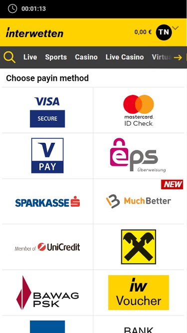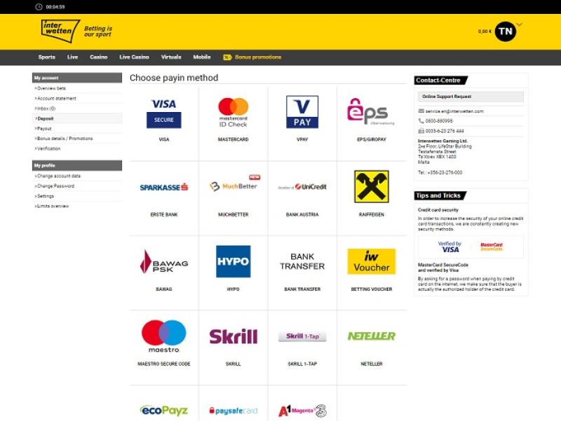 Banking銀⾏業務選項 的 Interwetten / iwcasino