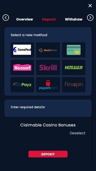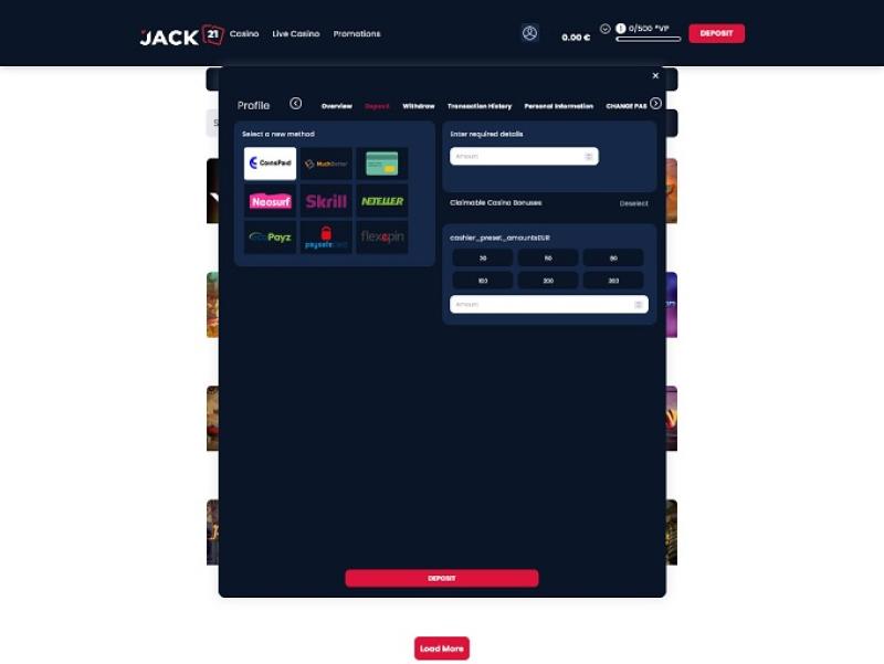 在這裡您可以找到 Jack21Casino 提供的不同銀行業務選項,包括存款和提款選項。
