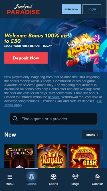 Jackpot Paradise Casino 由 Microgaming, Net Entertainment, Playtech, 1x2gaming, Barcrest, Big Time Gaming, ELK Studios, Evolution Gaming, EYECON, lightningboxgames, Novomatic, Play'n GO, Quickspin, Rabcat, Thunderkick, Wazdan, Pragmatic Play, Nolimit City, Red Tiger Gaming, Spinomenal, Fugaso, SYNOT Games, Skywind, Triple Edge Studios, Northern Lights Gaming, Stormcraft Studios, Switch Studios, All41 Studios, Gluck Games, Gameburger Studios, Pulse 8 Studios, Slot Factory, Neon Valley Studios, Shuffle Master, SpinPlay Games, Real Dealer Studios, GONG Gaming, On Air Entertainment, Buck Stakes Entertainment, Games Global, Ash Gaming, Blueprint Gaming, Greentube, NextGen, ProgressPlay, Tom Horn Gaming, WMS, Inspired Gaming, SG Interactive, Red7Mobile, CORE Gaming, Scientific Games, Reel Time Gaming, BF Games, Iron Dog Studio, Old Skool Studios, Betdigital, Just For The Win, PearFiction Studios, Wild Streak Gaming, Slingshot Studios, Fortune Factory Studios, Gamevy, Crazy Tooth Studio, Alchemy Gaming, Rarestone Gaming, Black Pudding Games, Snowborn Games, Hacksaw Gaming, Max Win Gaming, Gold Coin Studios, Half Pixel Studios, Aurum Signature Studios, Lucksome Gaming, Area Vegas, Wishbone Games, Circular Arrow, HammerTime Games, INO Games, Nailed It! Games, Neko Games, Reel Kingdom, Oros Gaming and Light & Wonder提供支持,其遊戲透過基於網路的平台以及允許透過智慧型手機和平板電腦玩的行動網站提供。Baccarat