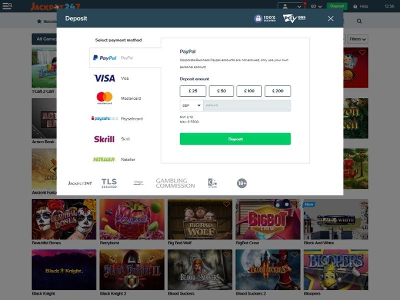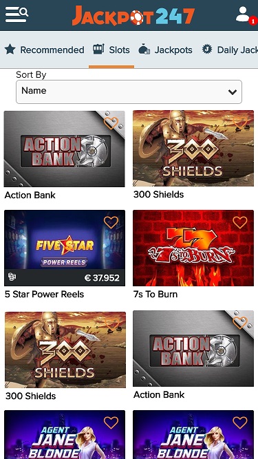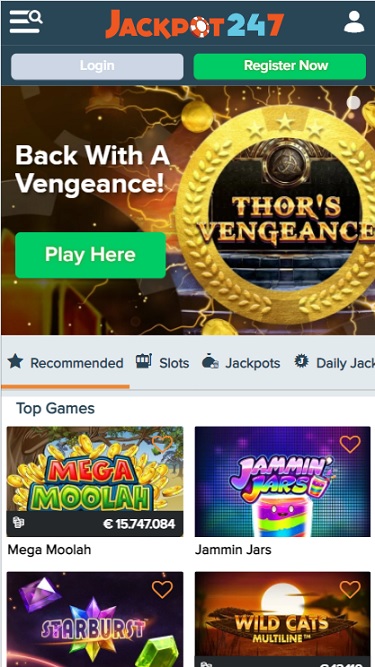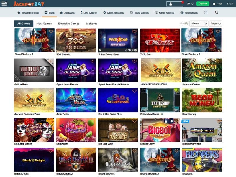 Jackpot247 賭場由 Microgaming, Net Entertainment, 1x2gaming, Barcrest, Big Time Gaming, ELK Studios, Evolution Gaming, EYECON, iSoftBet, lightningboxgames, Novomatic, Play'n GO, playson, Relax Gaming, Thunderkick, Yggdrasil, Realistic Games, Betgames, Stakelogic, Pragmatic Play, Nolimit City, Red Tiger Gaming, Fantasma Games, SYNOT Games, Kalamba, Triple Edge Studios, Northern Lights Gaming, Stormcraft Studios, SA Gaming, Electric Elephant Games, Pocket Games Soft, All41 Studios, Gameburger Studios, Neon Valley Studios, Spearhead Studios, TrueLab Games, Shuffle Master, GONG Gaming, Games Global, Wizard Games, 2by2 Gaming, Bally Technologies, Blueprint Gaming, Greentube, Leander Games, NextGen, Pariplay, Push Gaming, WMS, Inspired Gaming, Iron Dog Studio, Foxium, Just For The Win, Slingshot Studios, Jade Rabbit Gaming, Green Jade Games, STHLM Gaming, 4ThePlayer, AvatarUX, Gamevy, Crazy Tooth Studio, High 5 Games, ReelPlay, Alchemy Gaming, Plank Gaming, BB Games, Snowborn Games, Boomerang Studios, Hacksaw Gaming, Gold Coin Studios, Slotmill and SilverBack Gaming提供支持,其遊戲透過網頁平台提供,玩家可透過網路瀏覽器進行遊戲。此外,賭場還提供行動端網站,玩家可以透過智慧型手機或平板電腦進行遊戲。