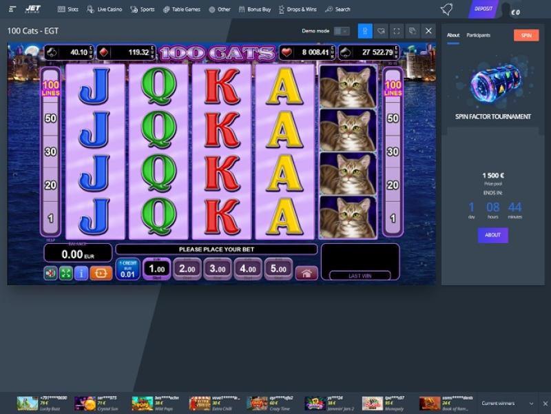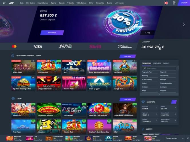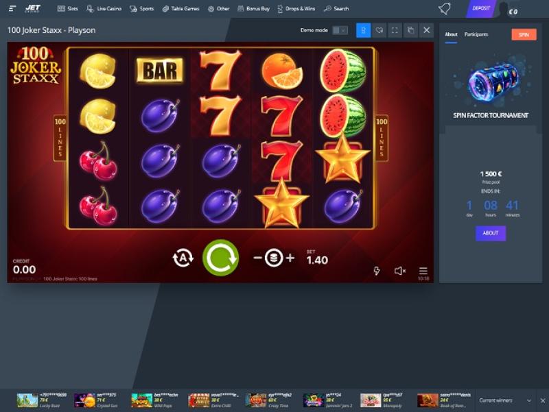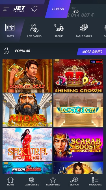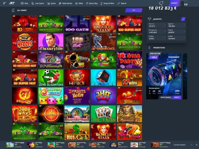 Jet 賭場提供多種老虎機遊戲:Shining Crown、Midas Golden Touch、Supreme Hot、Book of Dead、Iron Bank、Sakura Fortune、Legacy of Dead、Temple Tumble Megaways、Wild Harlequin、Greta Goes Wild、Razor Shark、10 Burning Heart、Sun of Egypt 2、Greta Goes Wild、Razor Shark、10 Burning Heart、Sun of Egypt. 2、Huge Catch、Lucky Dama Muerta、Braindead、Jammin' Jars 2、100 Burning Hot、Pimped、Ultimate Hot、100 Super Hot、Fire Joker 和 Hit the Gold! Hold and Win、Dinopolis、27 Wins、Van der Wilde and the Outlaws、Mongol Treasure、Money Train 2、Wild Toro II、Evil Goblins、50 Amazons' Battle、Book of Santa、Minotaurus、Esqueleto Explosivo 2、Rise of Merlin、Book of Horror Bellky 100 等等。