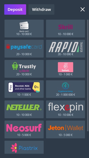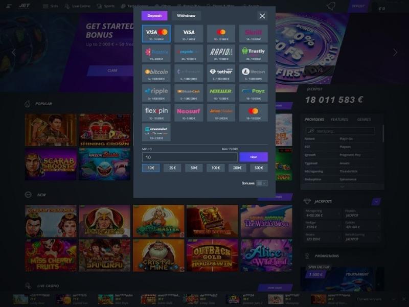Jet Casino 提供多種付款方式,包括支付卡、電子錢包、行動交易和各種加密貨幣支付方式。