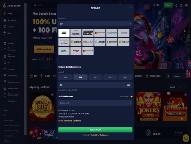 Joo 的銀行系統非常可靠,網站支援透過比特幣、Zimpler、Paysafecard、Visa、MasterCard、Maestro、Skrill、Neteller、Sofort 等多種方式進行存款和提款。賭場支付獎金非常迅速,比特幣幾乎可以立即到賬,而其他電子錢包則會在 24 小時內到達。每週獎金提現限額為 4,000 美元,即 4 比特幣,目前此限額正逐漸高於其他方式的 4,000 美元限額。