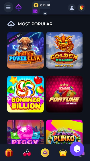 使用者可以瀏覽主頁,找到所有必要的版塊和類別。中心除了提供所有遊戲類別(包括最熱門遊戲、桌上遊戲和最新遊戲)外,還提供了大量獎金和促銷活動廣告。