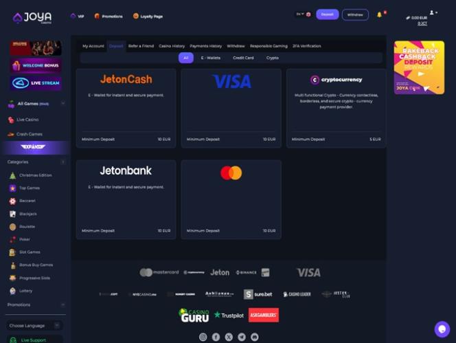 Banking銀⾏業務選項 的 Joya Casino